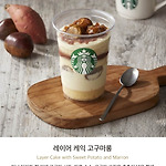 그 동안 먹어볼까말까 무지하게 고민했던 스타벅스 레이어 케익 고구마롱을 드뎌 먹어 보았다 발렌타인데이 즈음 출시되었던 메뉴인데 화이트데이가 되어서야 먹어봄 고구마시트이 고구마크림에 마롱 소스가 들어있는 이름만들어도 달달할 것 같은건 전부 다 들어간 듯 하다 제품의 칼로리는 404kcal 다이어트를 위해 식사 대용으로 단품으로 먹었다사진과 거의 흡사한 비주얼위에 작은 밤 세 개가 올라간 것이 앙증맞다정확한 단면은 이런 지층 형태의 모습 맨 아래 케익 시트가 깔려 있고 그 위에 고구마크림, 그 위에 케익시트 그 위에 마롱소스, 케익시트, 고구마크림, 마롱소스 차곡차곡 쌓여있다 스푼이 아니라 포크를 주는데 무스 케익 같은 질감이라 포크로도 충분히 잘 떠진다 그리고 전체적으로 크림크림한 제형이라서 레이..