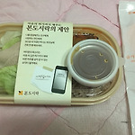다이어트용 도시락인 본 도시락의 훈제 닭가슴살 도시락(5500원) 본죽의 서브브랜드? 인 본도시락은 항상 궁금했는데 도시락치곤 저렴하지 않은 가격 때문에 선뜻 사먹지 못하였다 하지만 어제 혼자서 저녁 해 먹기도 귀찮고 라면 끓여먹으려고 물 올려놓고 있다가 마침 퇴근한 동생이 회사에서 저녁으로 받아온 이 닭가슴살 도시락을 투척하였다 침대에서 찍은 사진이라 배경이 이불이라 죄송합니다 도시락은 한솥도시락에 비해 무게가 좀 나가고 훈제라고 하지만 그냥 삶은 것 같은 허연 살이 야채 위에 올려져 있다 함께 주는 소스를 닭고기 위에 뿌려서 먹으면 되는데 닭가슴살보다는 샐러드와 잘 어울리는 식초베이스의 시큼한 소스이다 밥이 없이 닭고기와 야채만 먹으면 맛있는데 밥과 함께 먹기에는 밥 반찬이라는 느낌은..